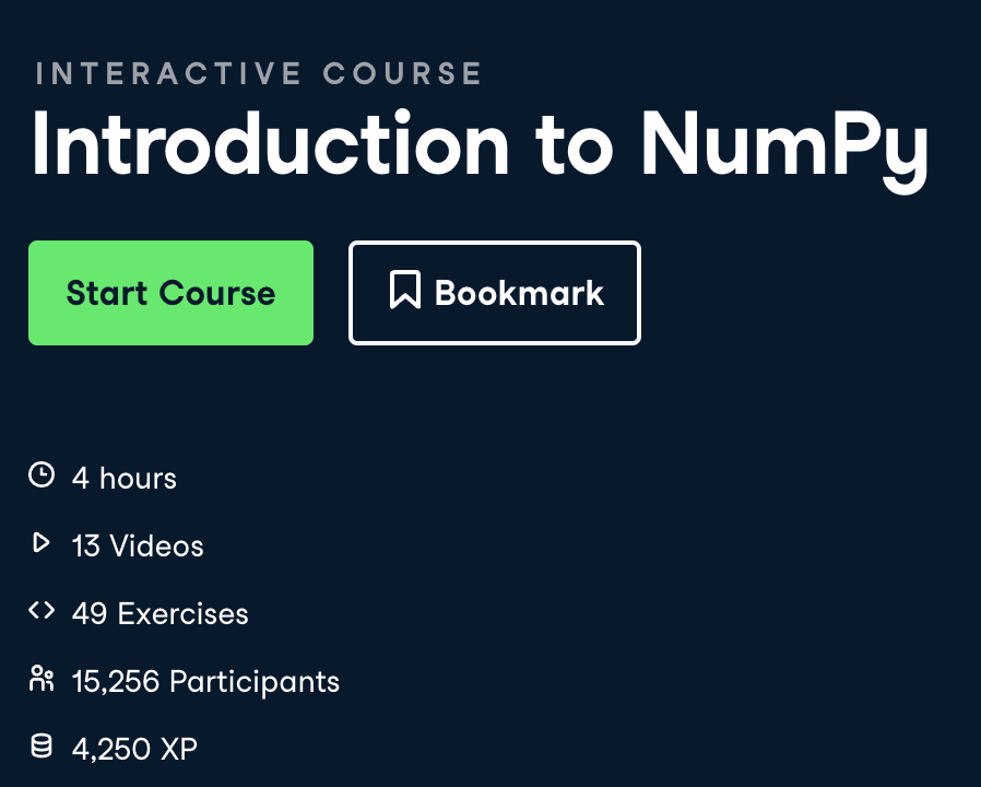 8주차 학습 material URL: https://app.datacamp.com/learn/courses/introduction-to-numpy