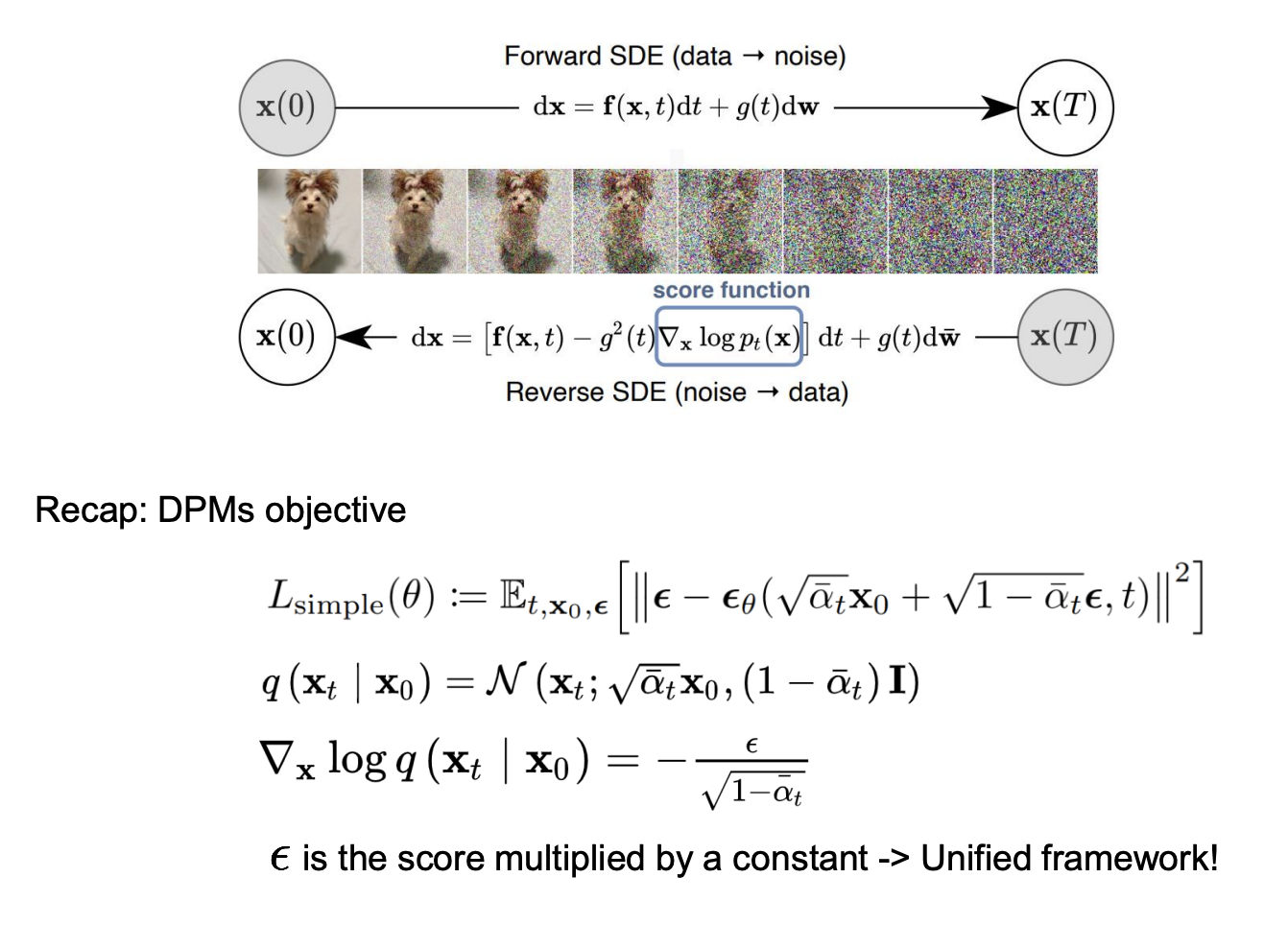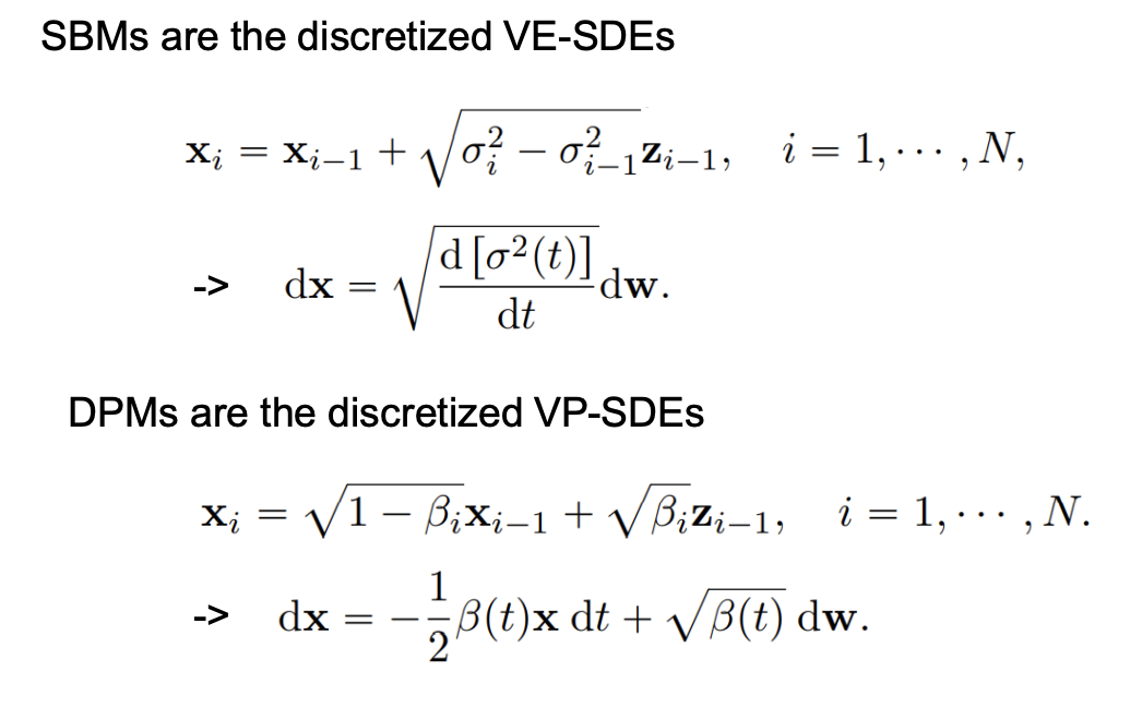 - DPMs and SBMs (Song & Ermon) are the discretizations of VP and VE SDEs.
