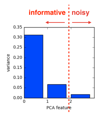 - 높낮이를 통해 노이즈(버릴 feature)로 가정하고 더 높은 분산 PCA 기능을 유지하며, 해당 feature는 가져감