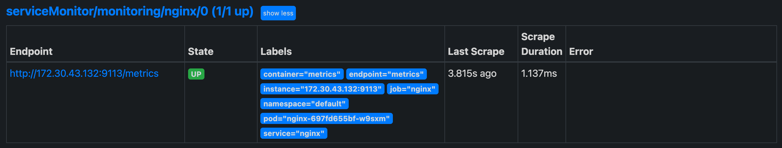 - 서비스 모니터링 생성 후 1분 정도 후, 프로메테우스 웹서버에서 Status → Targets 에 nginx 서비스 모니터 추가 확인
