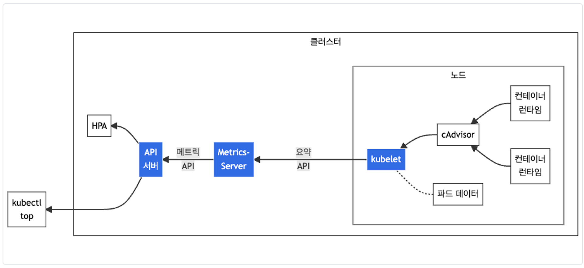 - kubelet으로부터 수집한 리소스 메트릭을 수집 및 집계하는 클러스터 애드온 구성 요소