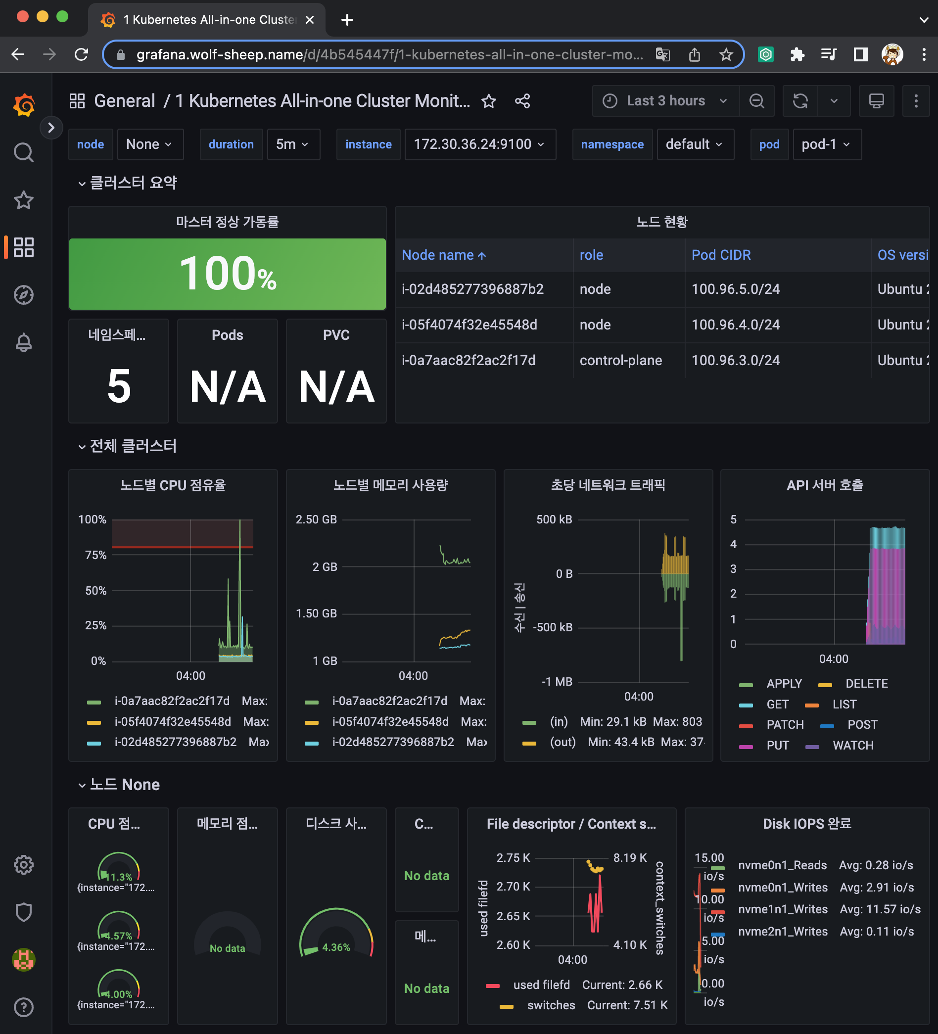 - (대략) 분류 : 자원 사용량 - Cluster/POD Resources, 노드 자원 사용량 - Node Exporter, 주요 애플리케이션 - CoreDNS 등