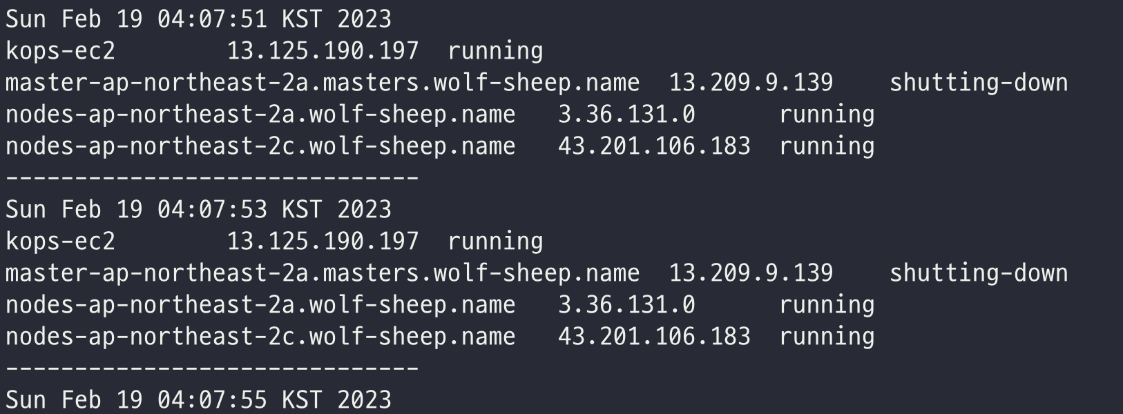 while true; do aws ec2 describe-instances --query "Reservations[*].Instances[*].{PublicIPAdd:PublicIpAddress,InstanceName:Tags[?Key=='Name']|[0].Value,Status:State.Name}" --output text | sort; echo "------------------------------" ;date; sleep 1; done