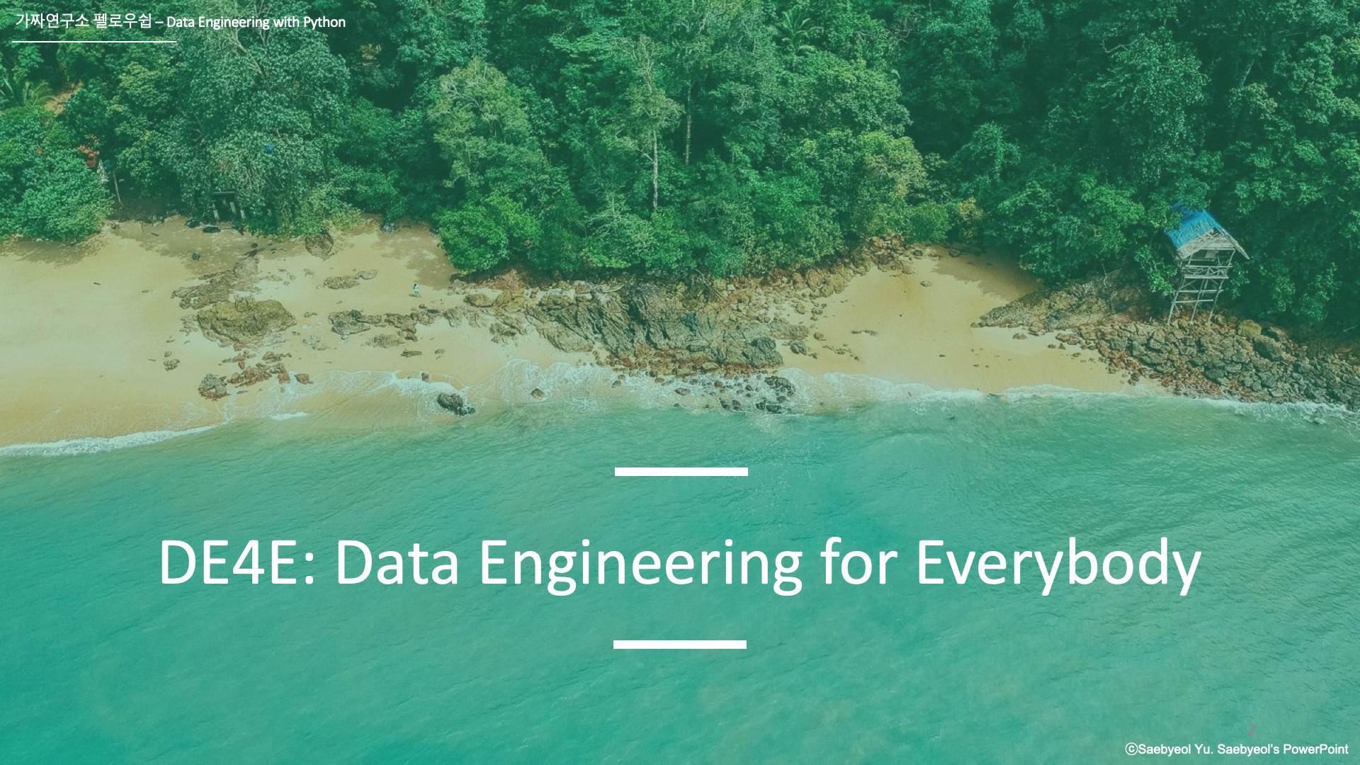 참여하는 스터디는 DE4E 로 Data Engineering for Everbody 의 줄임말이며, 데이터 엔지니어링 이 메인 주제입니다!