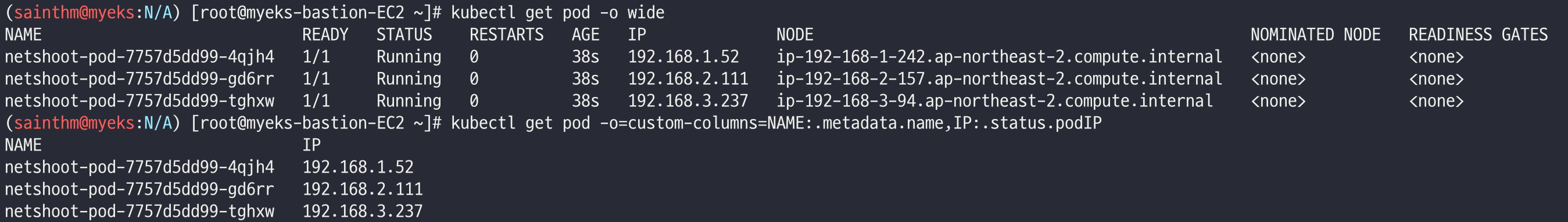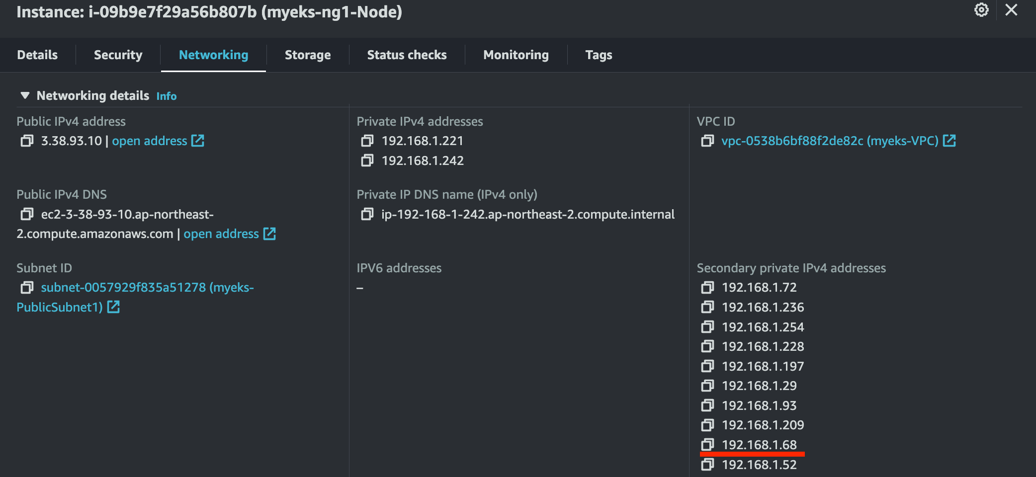 - kube-proxy, aws-node는 host(실습 중 노드)의 IP를 그대로 사용