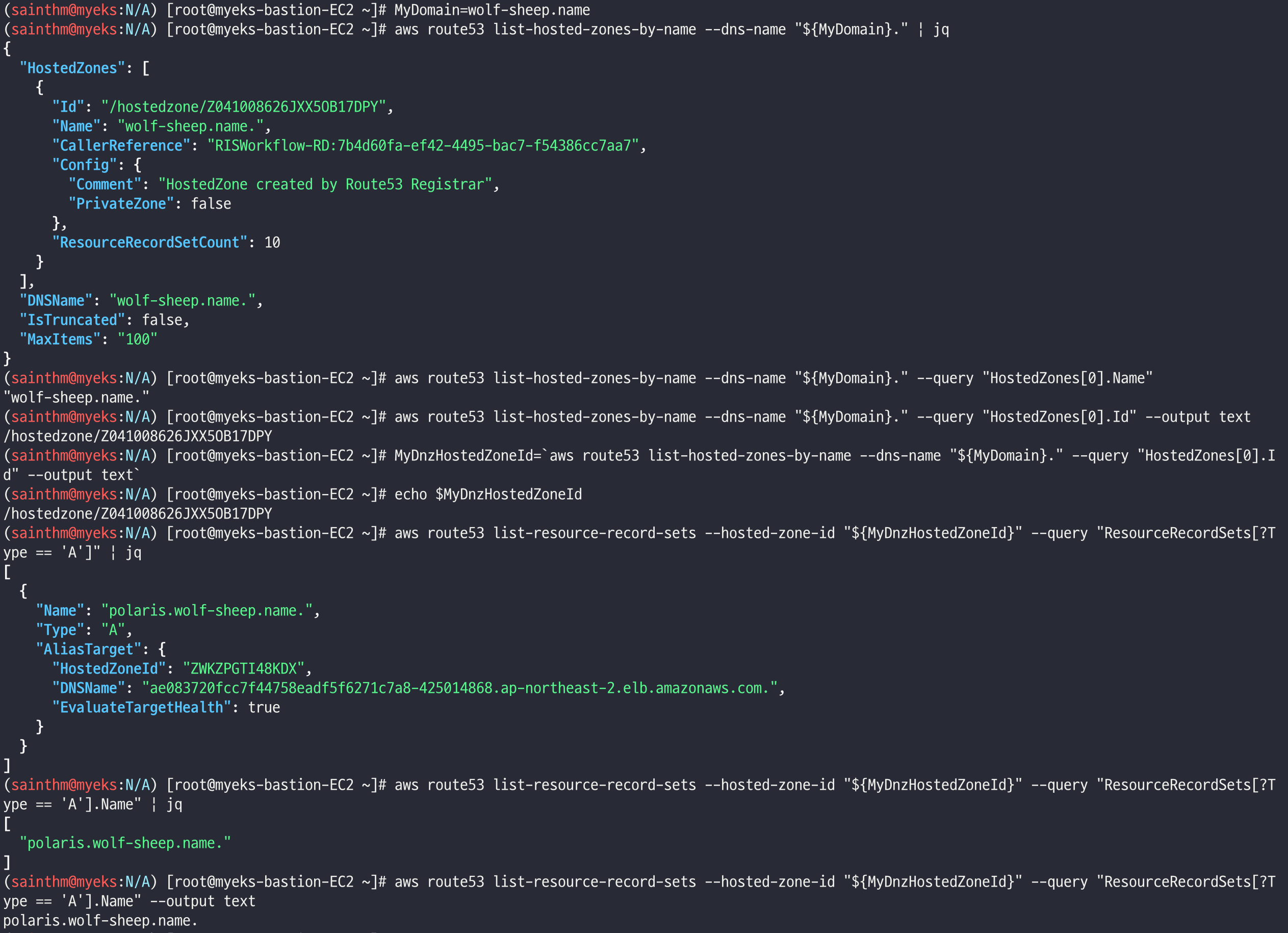 MyDnzHostedZoneId=$(aws route53 list-hosted-zones-by-name --dns-name "${MyDomain}." --query "HostedZones[0].Id" --output text)