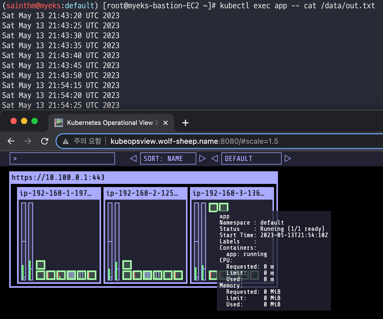 # date 명령어로 현재 시간을 10초 간격으로 /home/pod-out.txt 파일에 저장