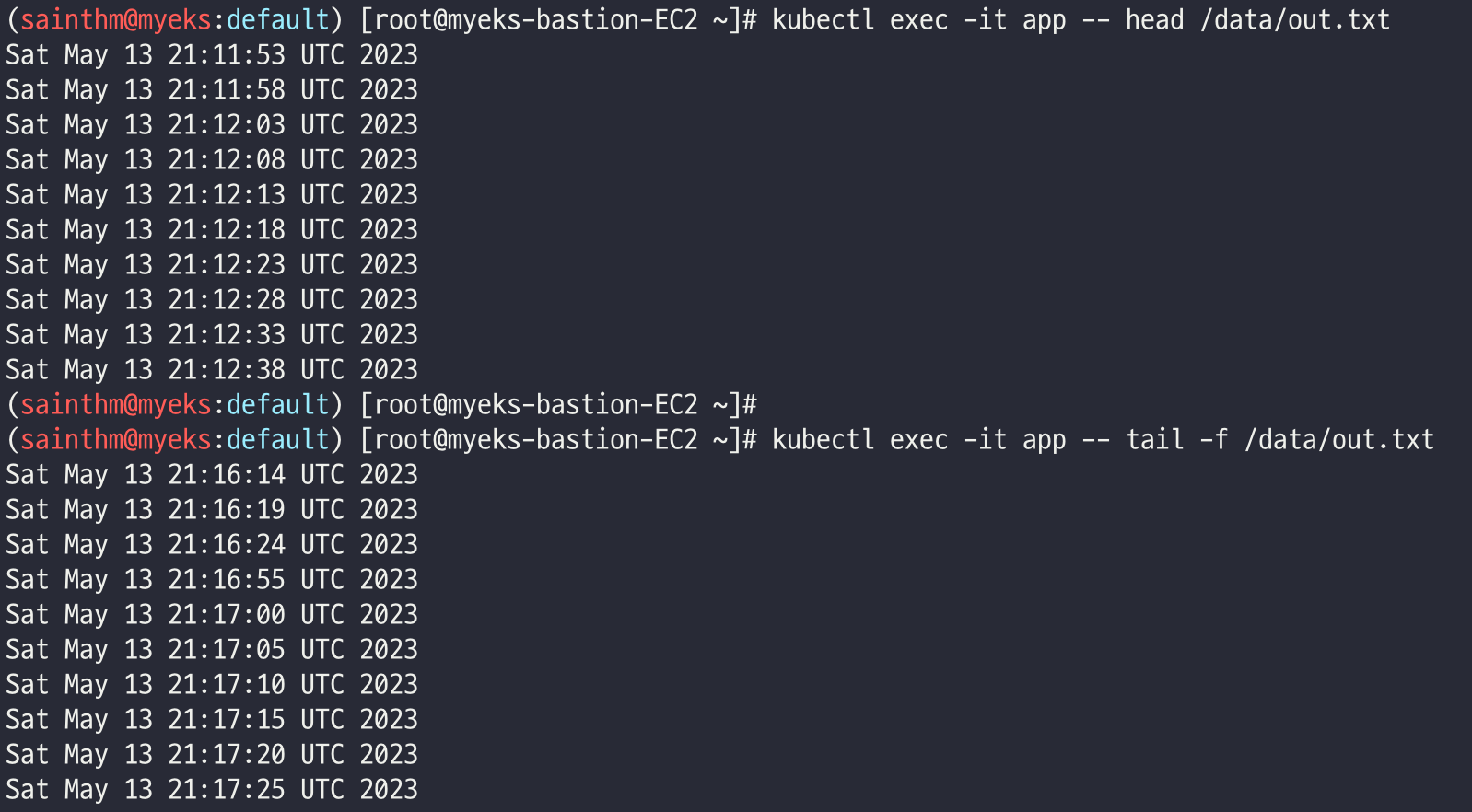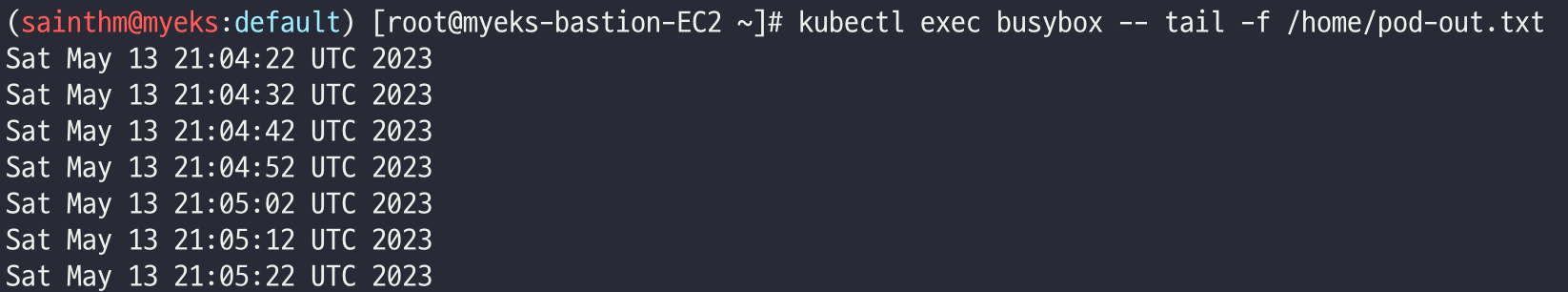 kubectl exec busybox -- tail -f /home/pod-out.txt