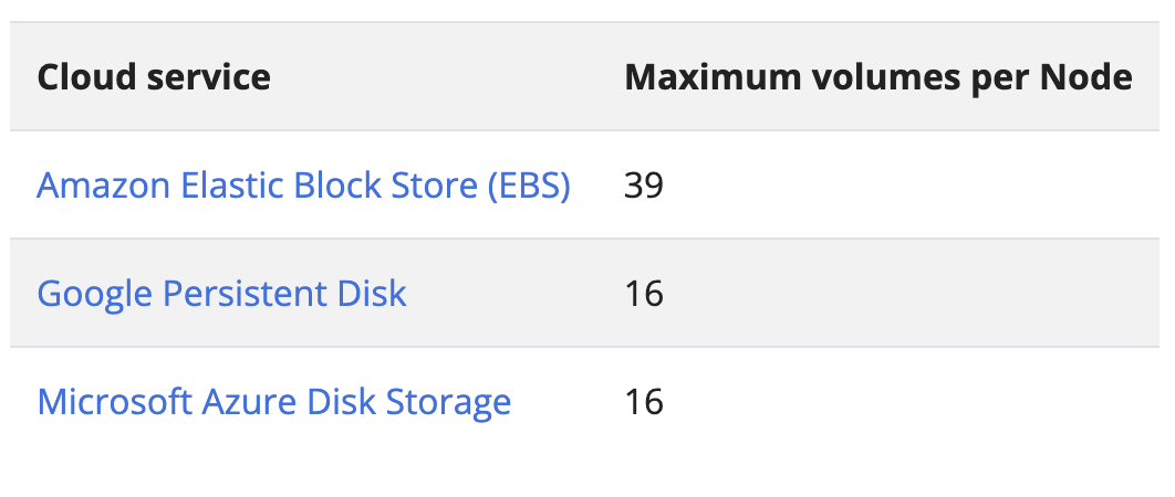 볼륨 연결 제한에 대한 공식 링크 URL: https://kubernetes.io/docs/concepts/storage/storage-limits/