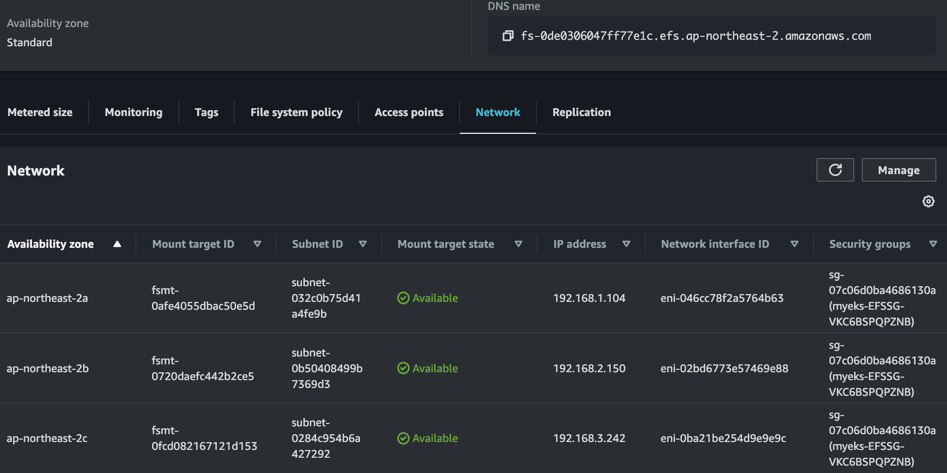 mount -t nfs4 -o nfsvers=4.1,rsize=1048576,wsize=1048576,hard,timeo=600,retrans=2,noresvport fs-0de0306047ff77e1c.efs.ap-northeast-2.amazonaws.com:/ /mnt/myefs