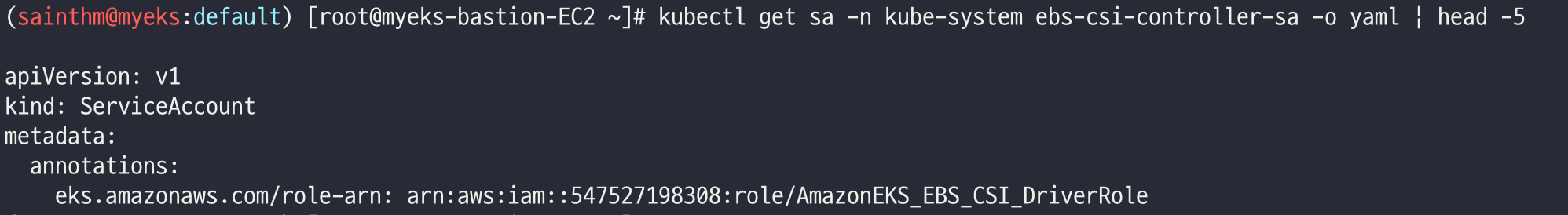 kubectl get sa -n kube-system efs-csi-controller-sa -o yaml | head -5