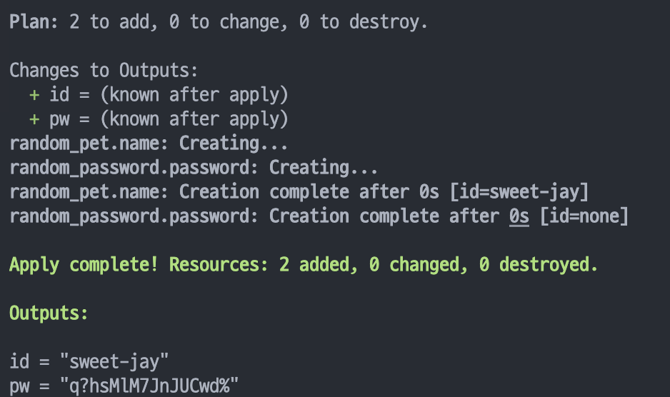 - random_pet는 이름을 자동으로 생성하고, random_password는 사용자의 패스워드를 설정한다 - random_pet