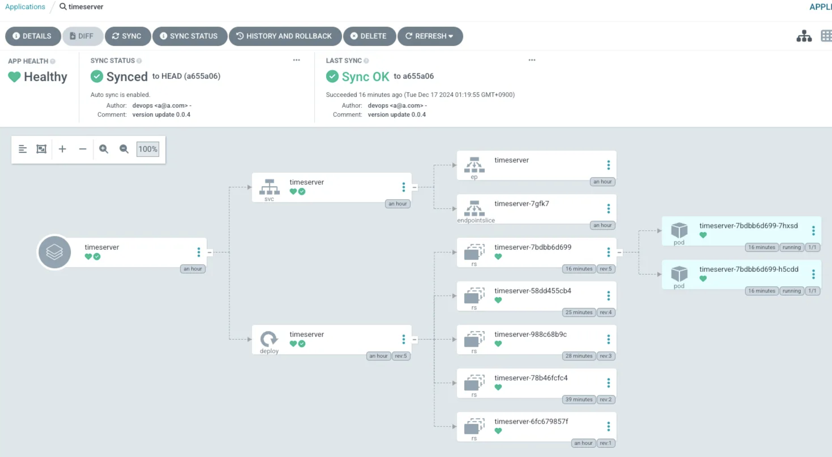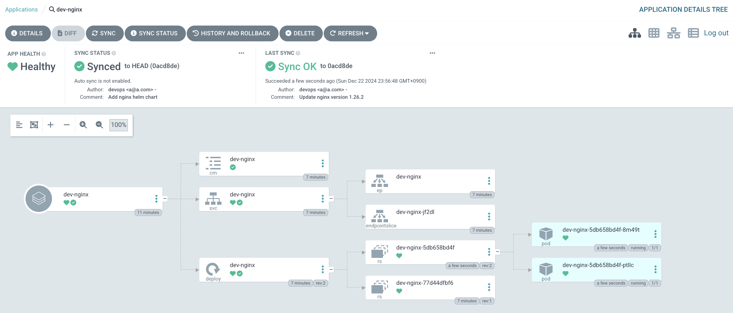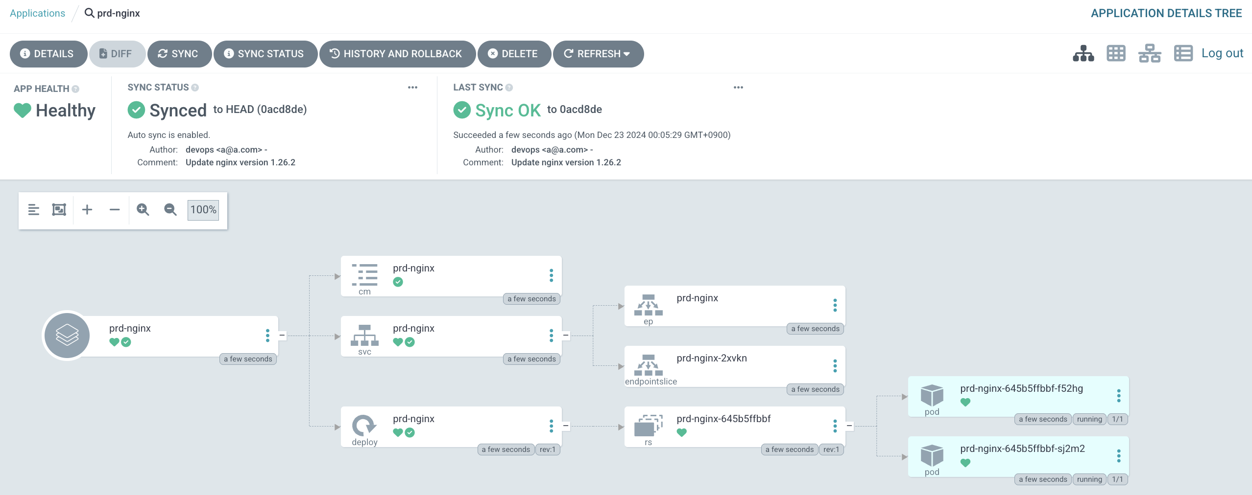 - Argo CD app 가 최대 3분 사이에 변경 확인 후 AutoSync 로 신규 버전 업데이트 진행