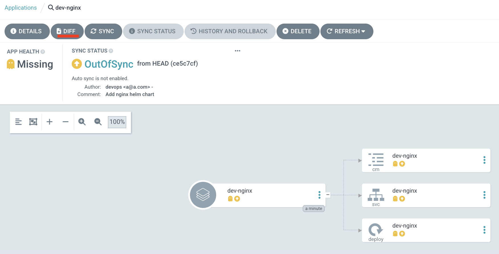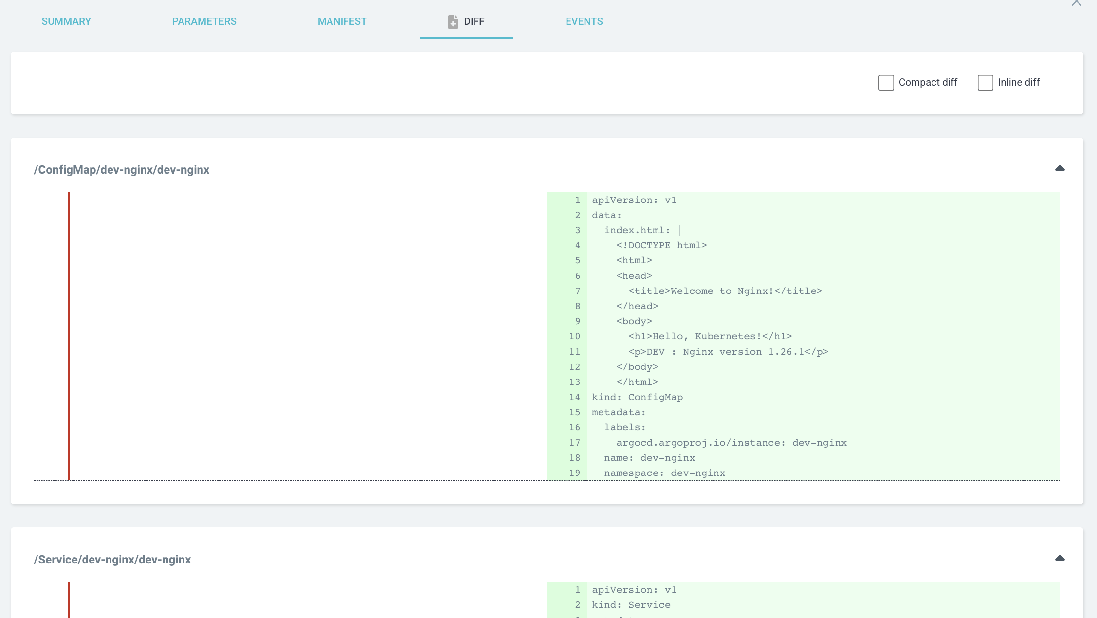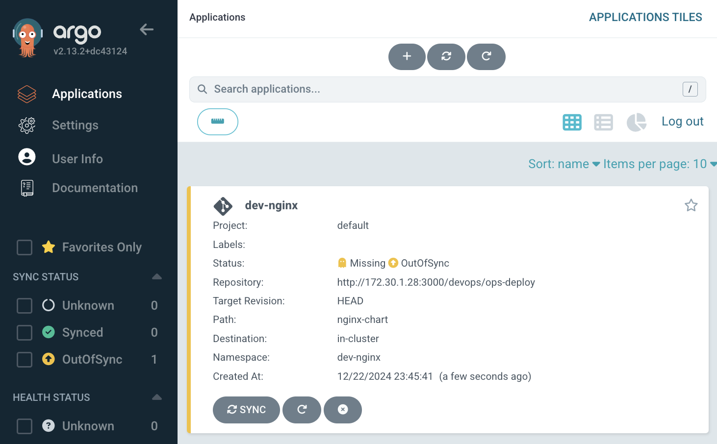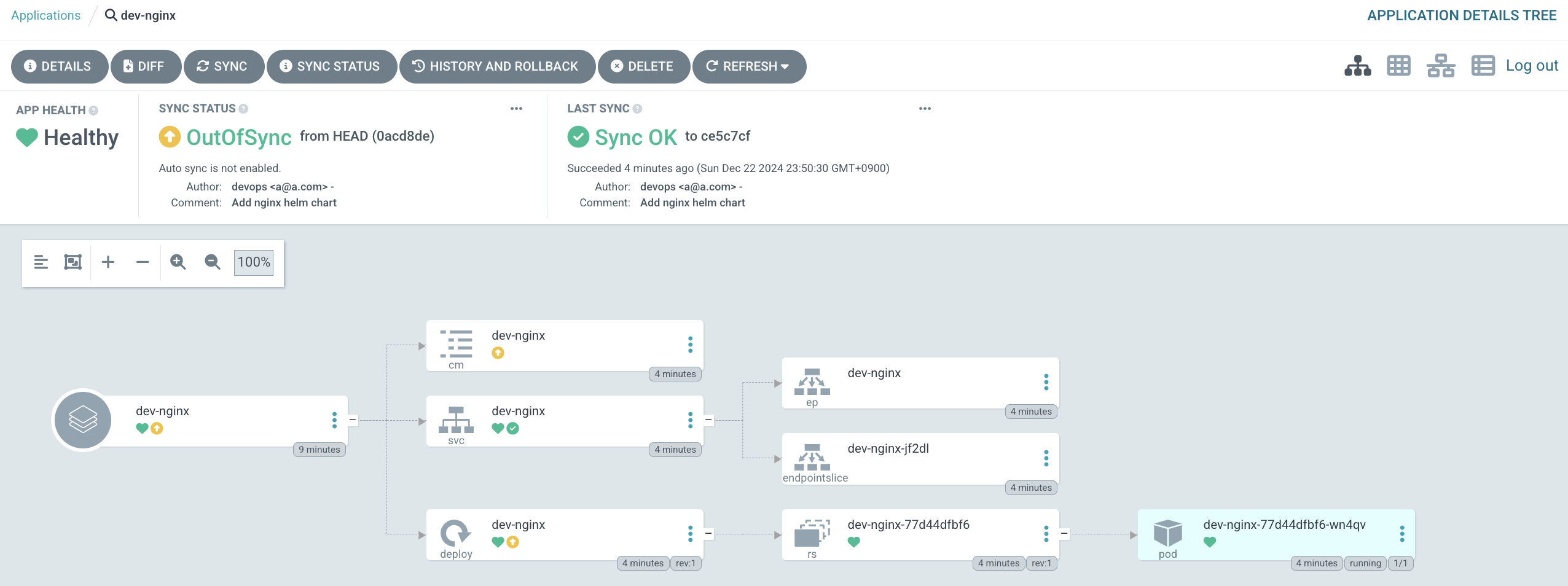 - Argo CD app 가 최대 3분 사이에 변경 확인 후 AutoSync 로 신규 버전 업데이트 진행