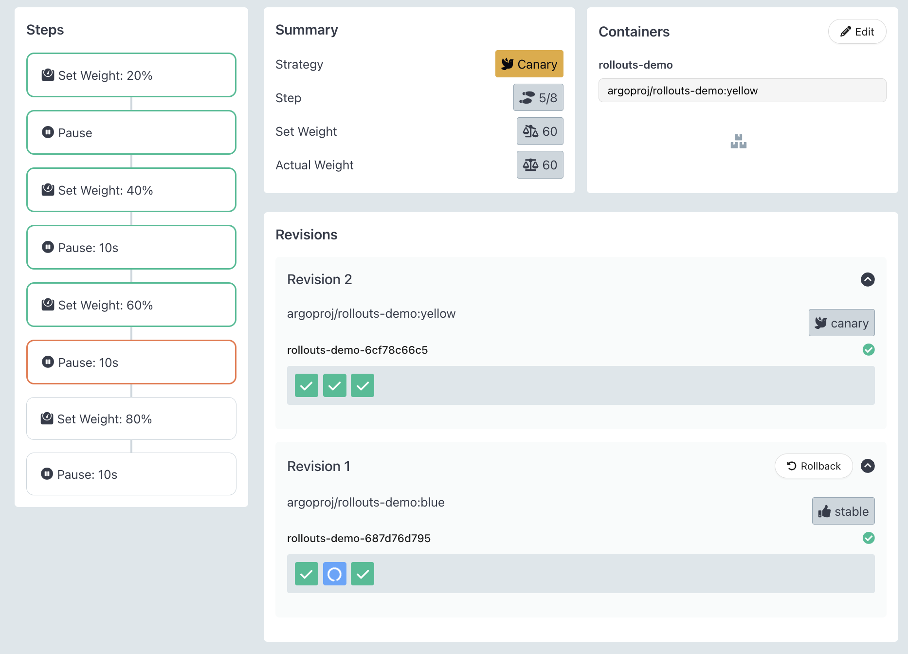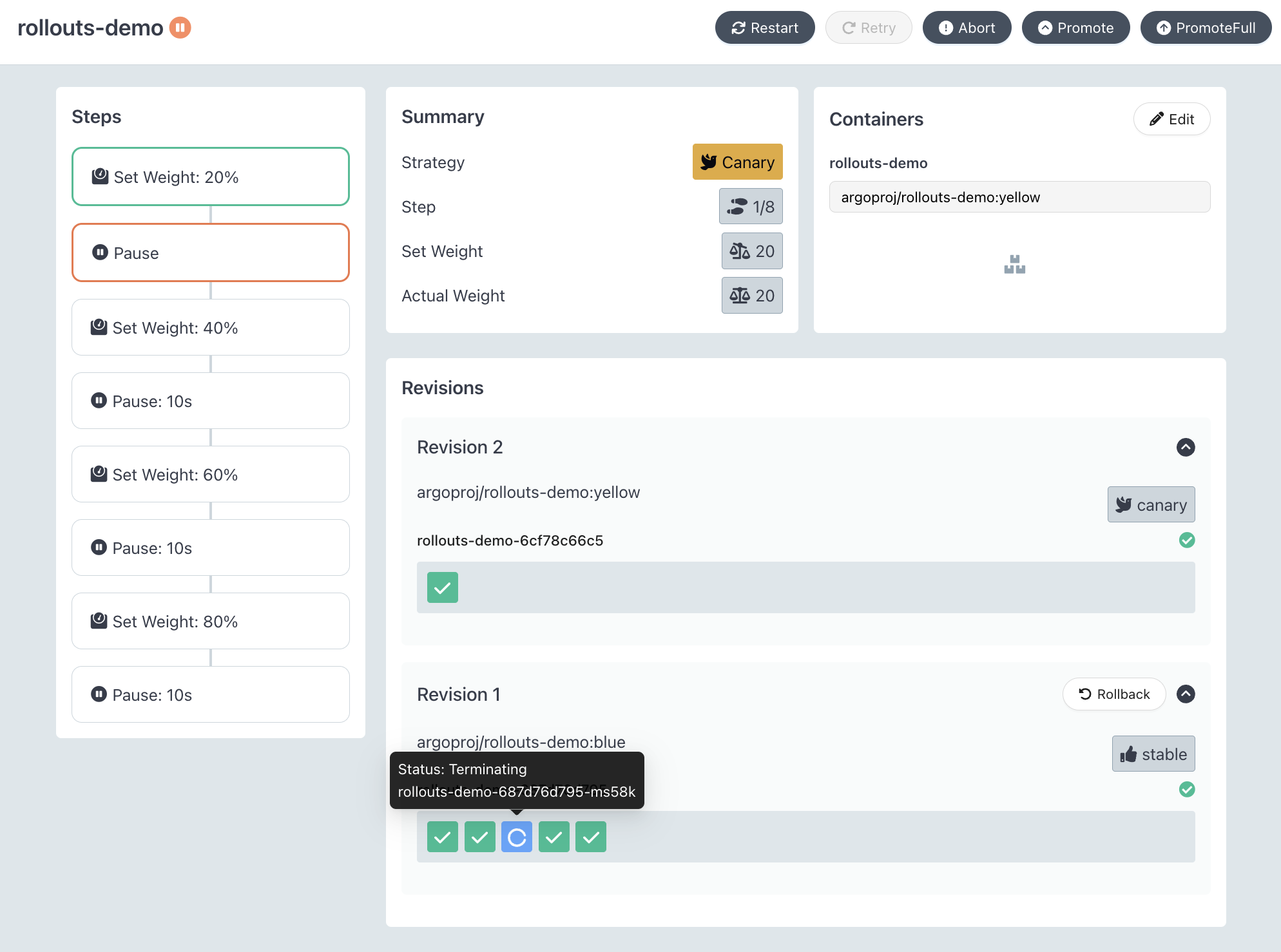 # Run the following command to update the rollouts-demo Rollout with the "yellow" version of the container: