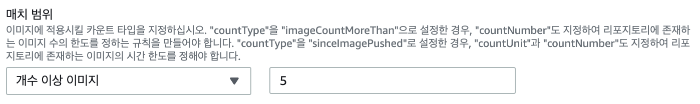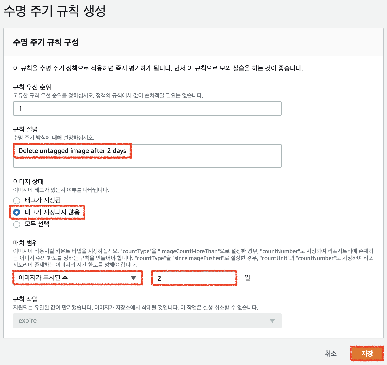 - 태그가 지정되지 않음 (untagged) 규칙의 경우, 리포지토리 별로 하나만 설정 가능합니다.