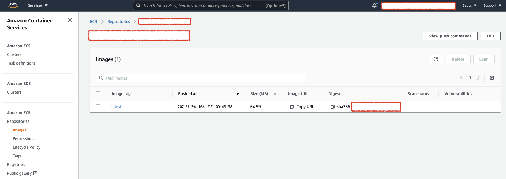 기존에 생성하셨던 리포지토리가 있으셨다면 Amazon ECR Repositories 탭으로 바로 접속이되며,