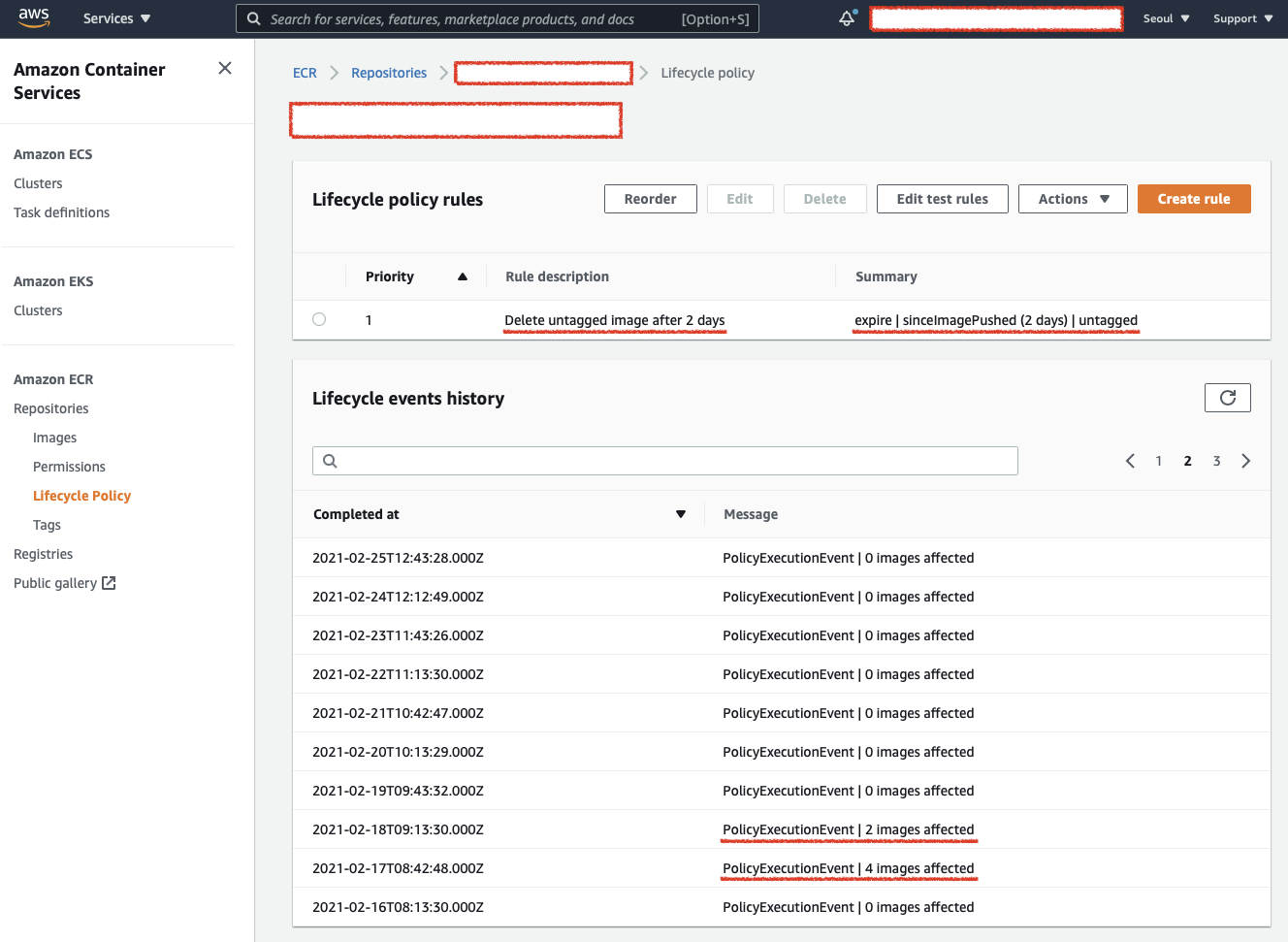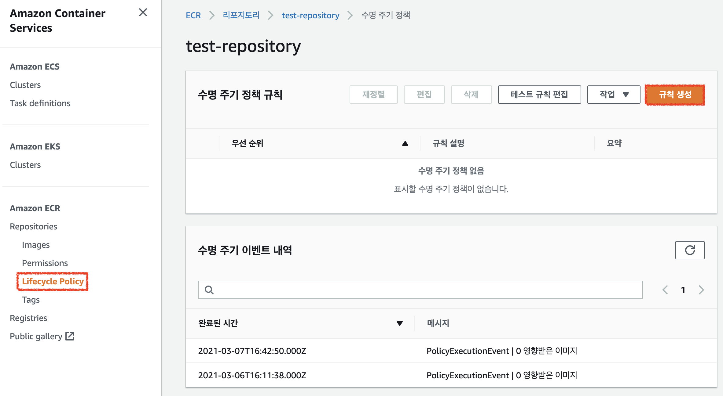 - Amazon ECR 수명 주기 정책을 통해, Repository를 관리하실 수 있습니다.