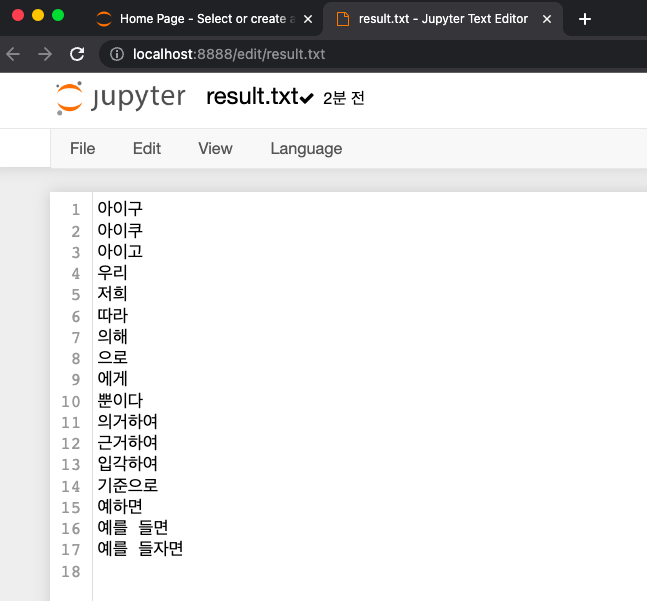 f.write(line + '\n') # 괄호 안에 들어가는 것을 result.txt 파일로 저장!