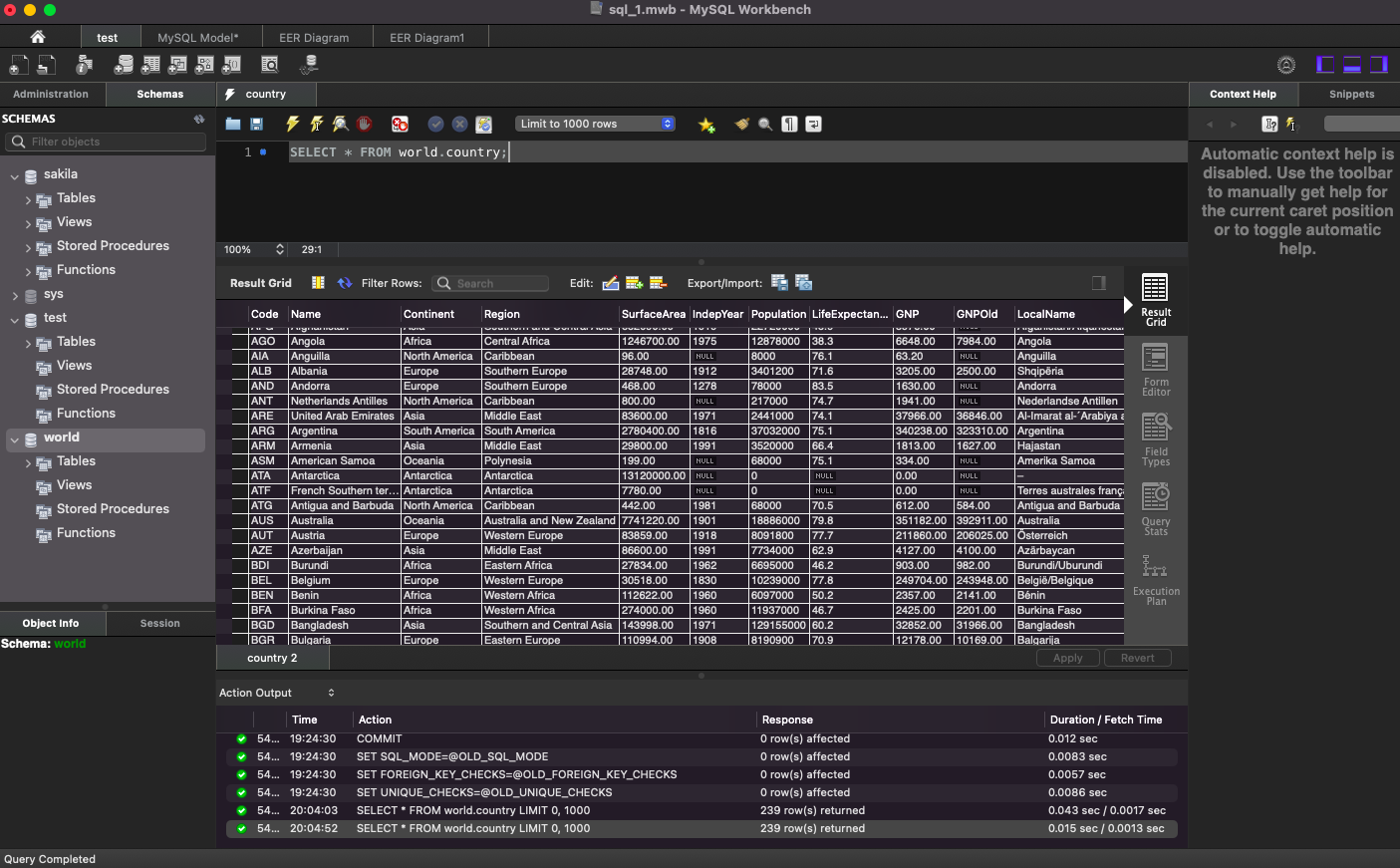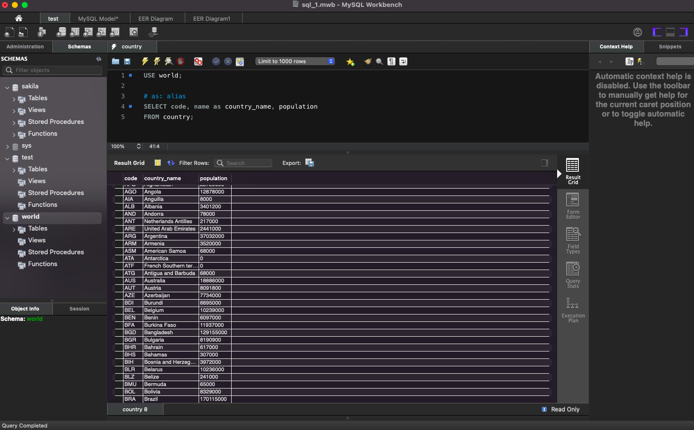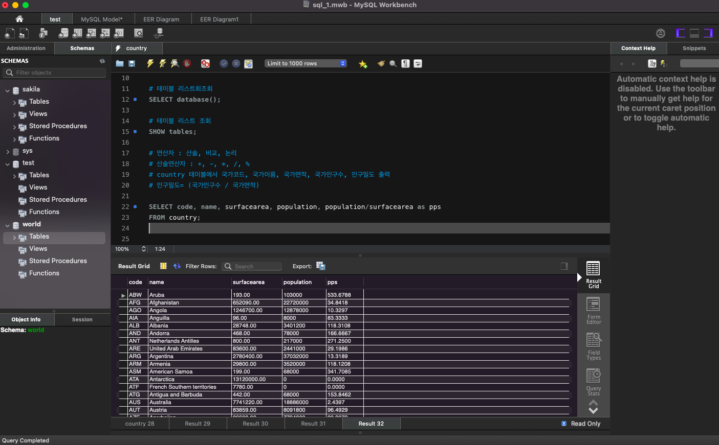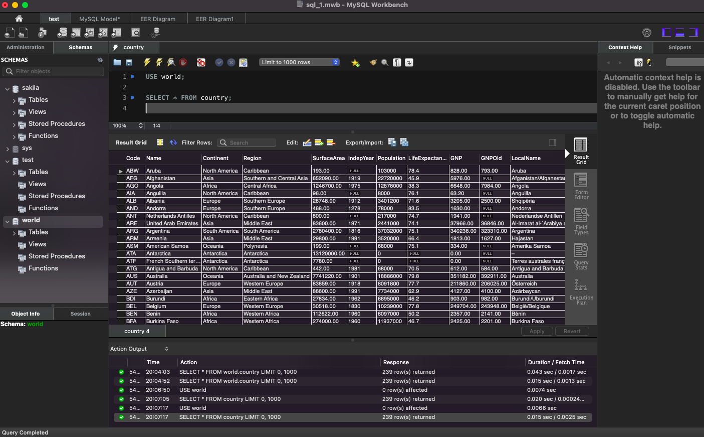 world 데이터베이스의 country 테이블에 있는 데이터 출력: