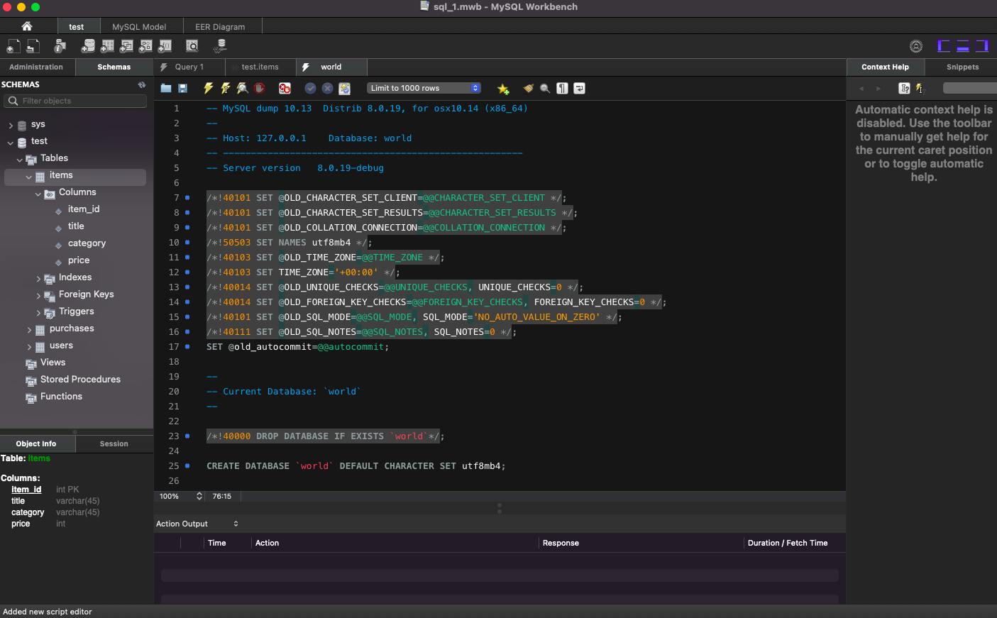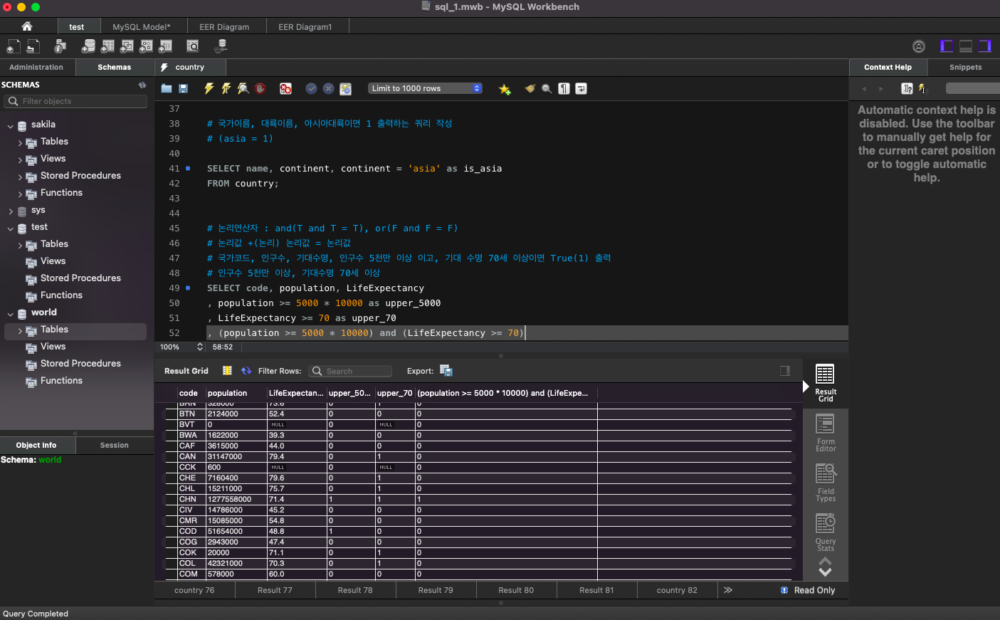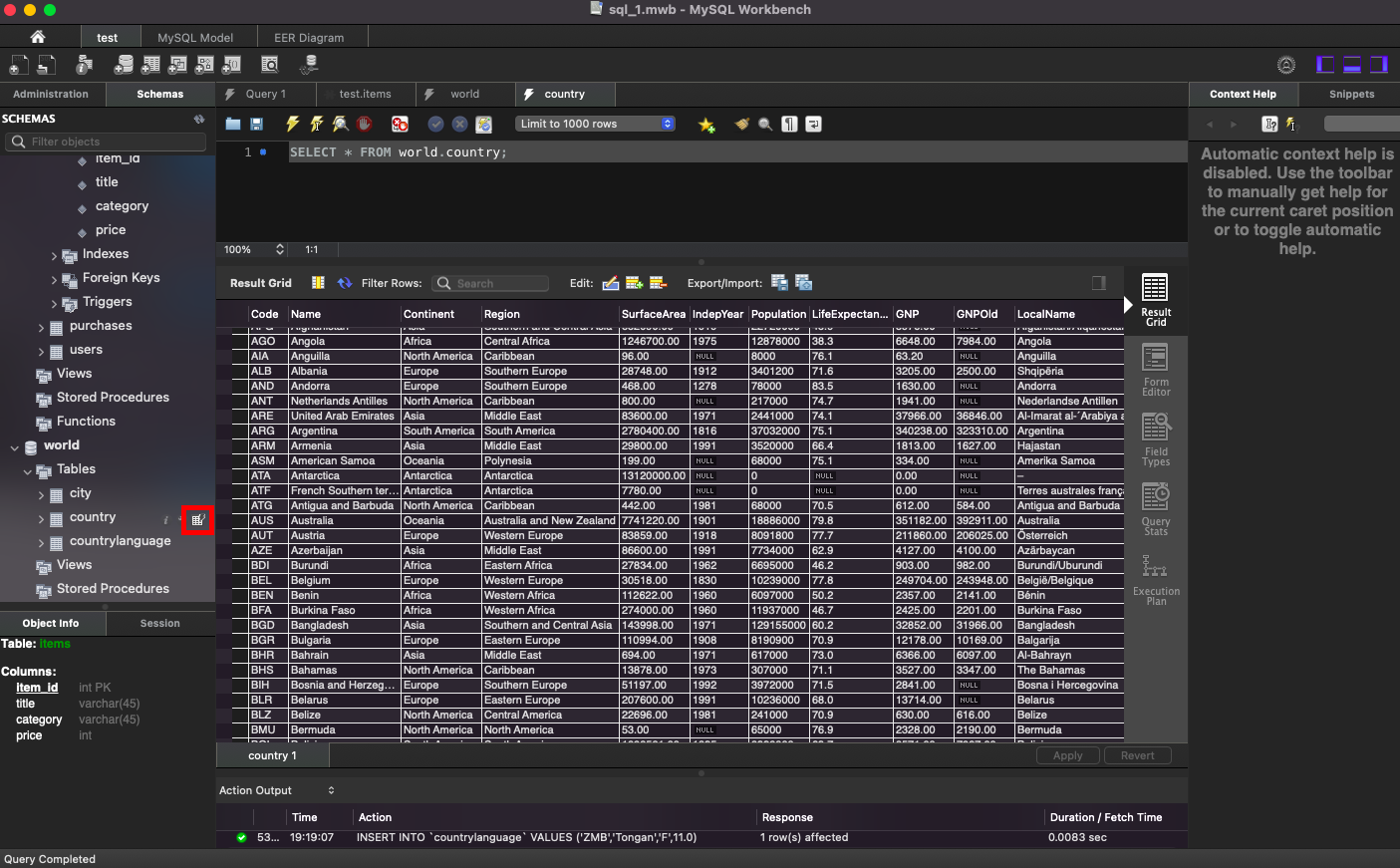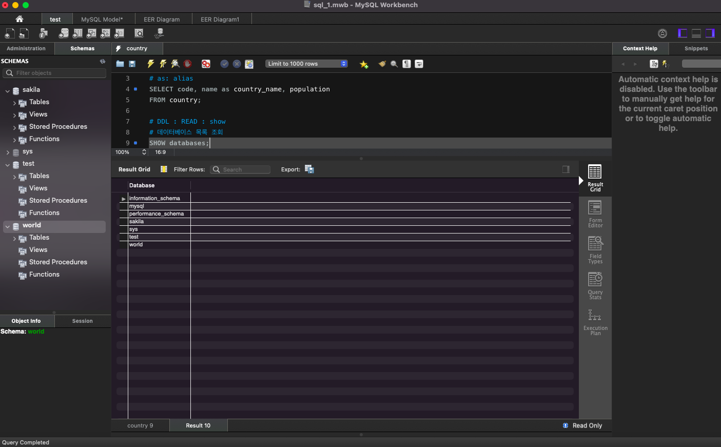 world 데이터베이스의 country 테이블에 있는 데이터 출력: