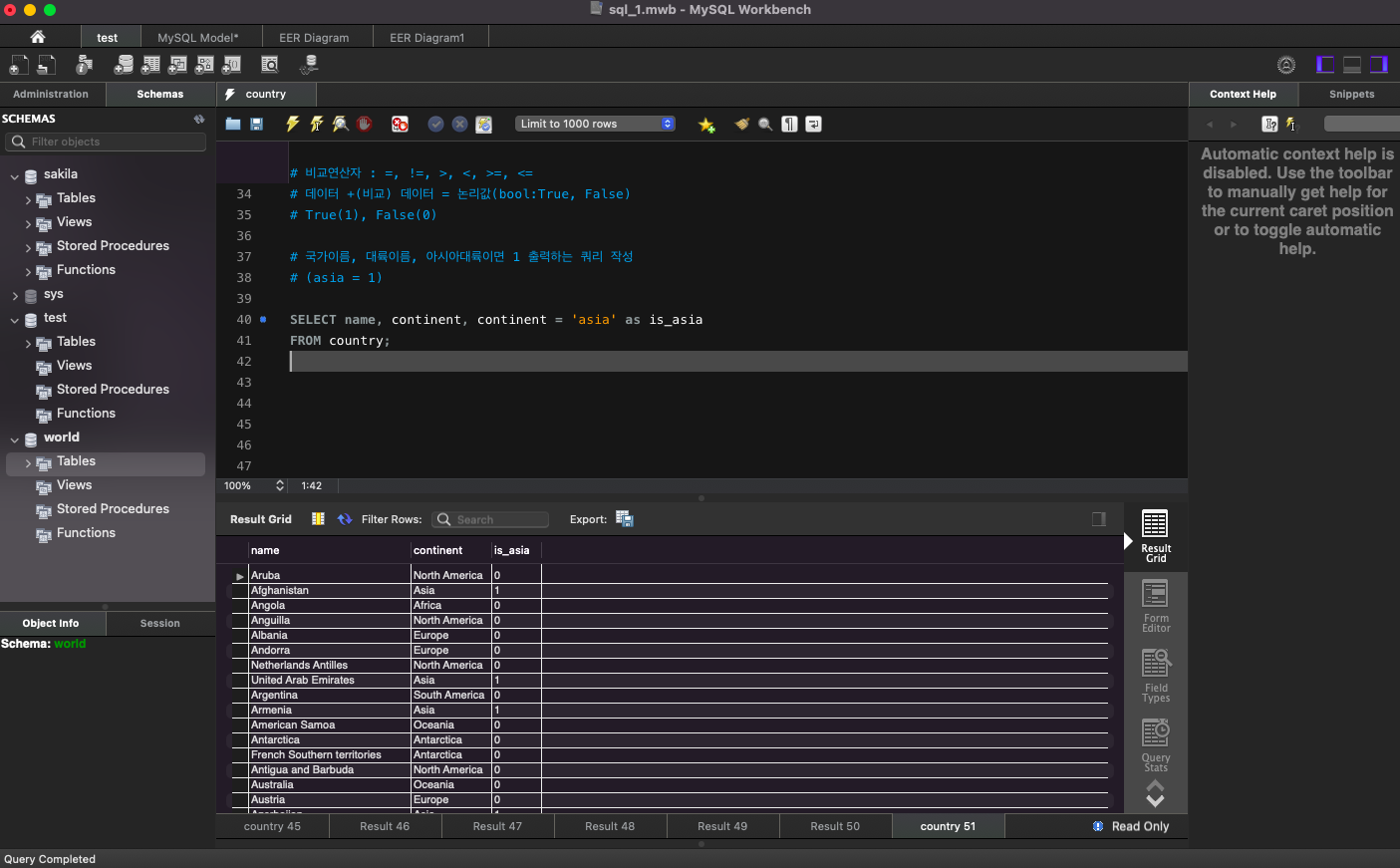 # 국가이름, 대륙이름, 아시아대륙이면 1 출력하는 쿼리 작성