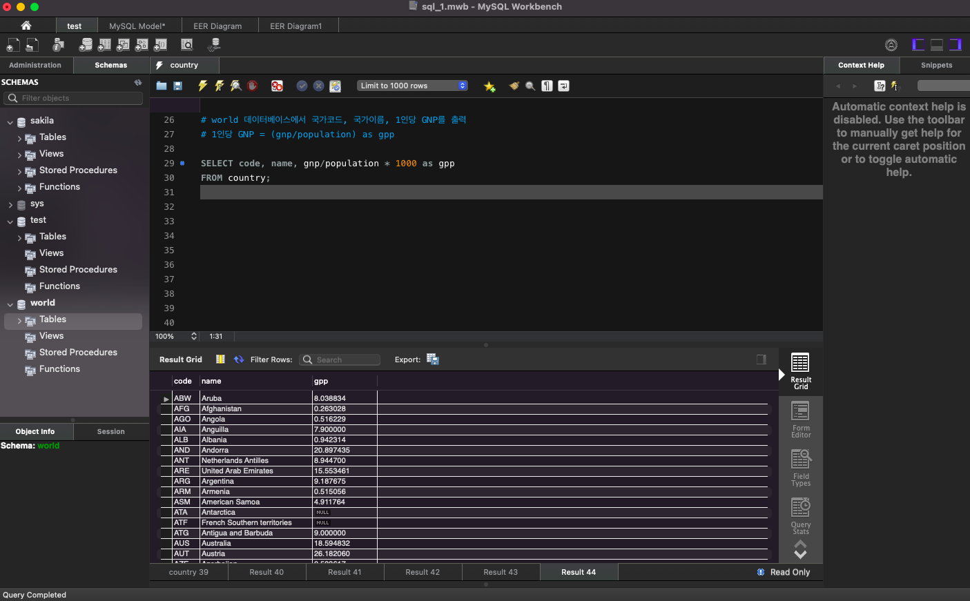 # world 데이터베이스에서 국가코드, 국가이름, 1인당 GNP를 출력