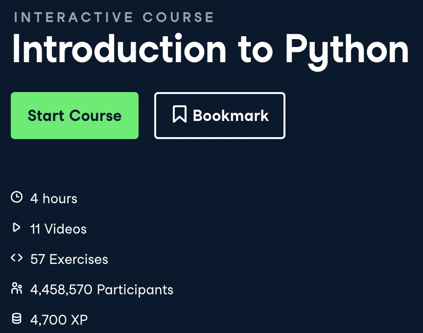 Python is a general-purpose programming language that is becoming ever more popular for data science. Companies worldwide are using Python to harvest insights from their data and gain a competitive edge. Unlike other Python tutorials, this course focuses on Python specifically for data science. In our Introduction to Python course, you’ll learn about powerful ways to store and manipulate data, and helpful data science tools to begin conducting your own analyses. Start DataCamp’s online Python curriculum now.