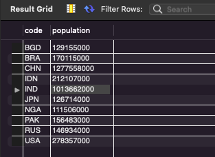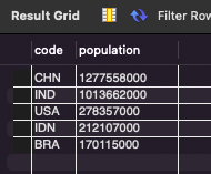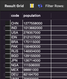 # 국가의 인구수가 많은 순으로 정렬해서 국가코드, 인구수 출력