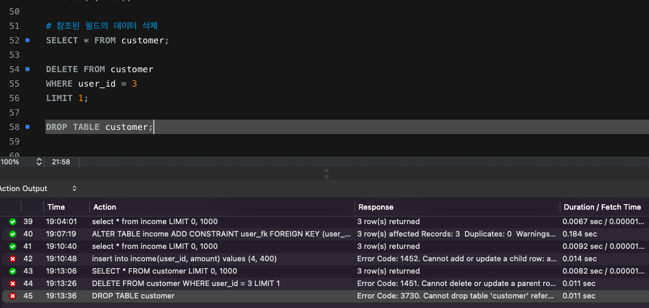 # restrict: 에러 발생 : 수정, 삭제 불가