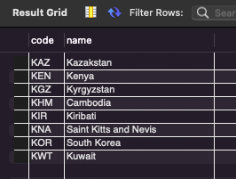 # 국가코드가 K로 시작하는 국가의 국가코드, 국가이름 출력