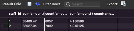 SELECT staff_id, sum(amount), count(amount), sum(amount) / count(amount)