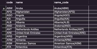 SELECT code, name, concat(name, "(", code, ")") as name_code