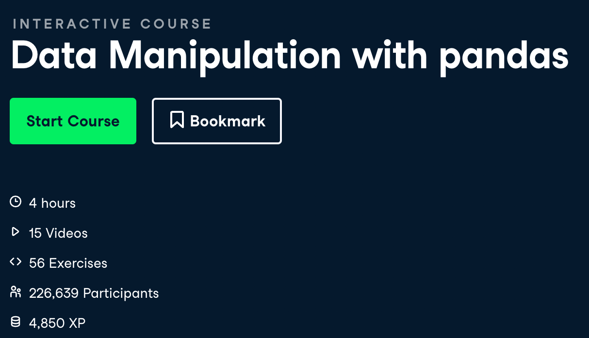 pandas is the world's most popular Python library, used for everything from data manipulation to data analysis. In this course, you'll learn how to manipulate DataFrames, as you extract, filter, and transform real-world datasets for analysis. Using pandas you’ll explore all the core data science concepts. Using real-world data, including Walmart sales figures and global temperature time series, you’ll learn how to import, clean, calculate statistics, and create visualizations—using pandas to add to the power of Python!