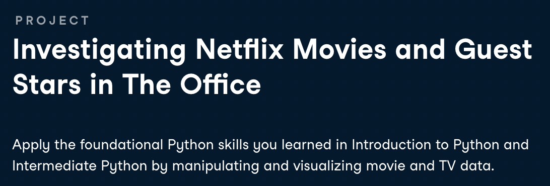 In this project, you’ll apply the skills you learned in Introduction to Python and Intermediate Python to solve a real-world data science problem. You’ll press “watch next episode” to discover if Netflix’s movies are getting shorter over time and which guest stars appear in the most popular episode of "The Office", using everything from lists and loops to pandas and matplotlib.