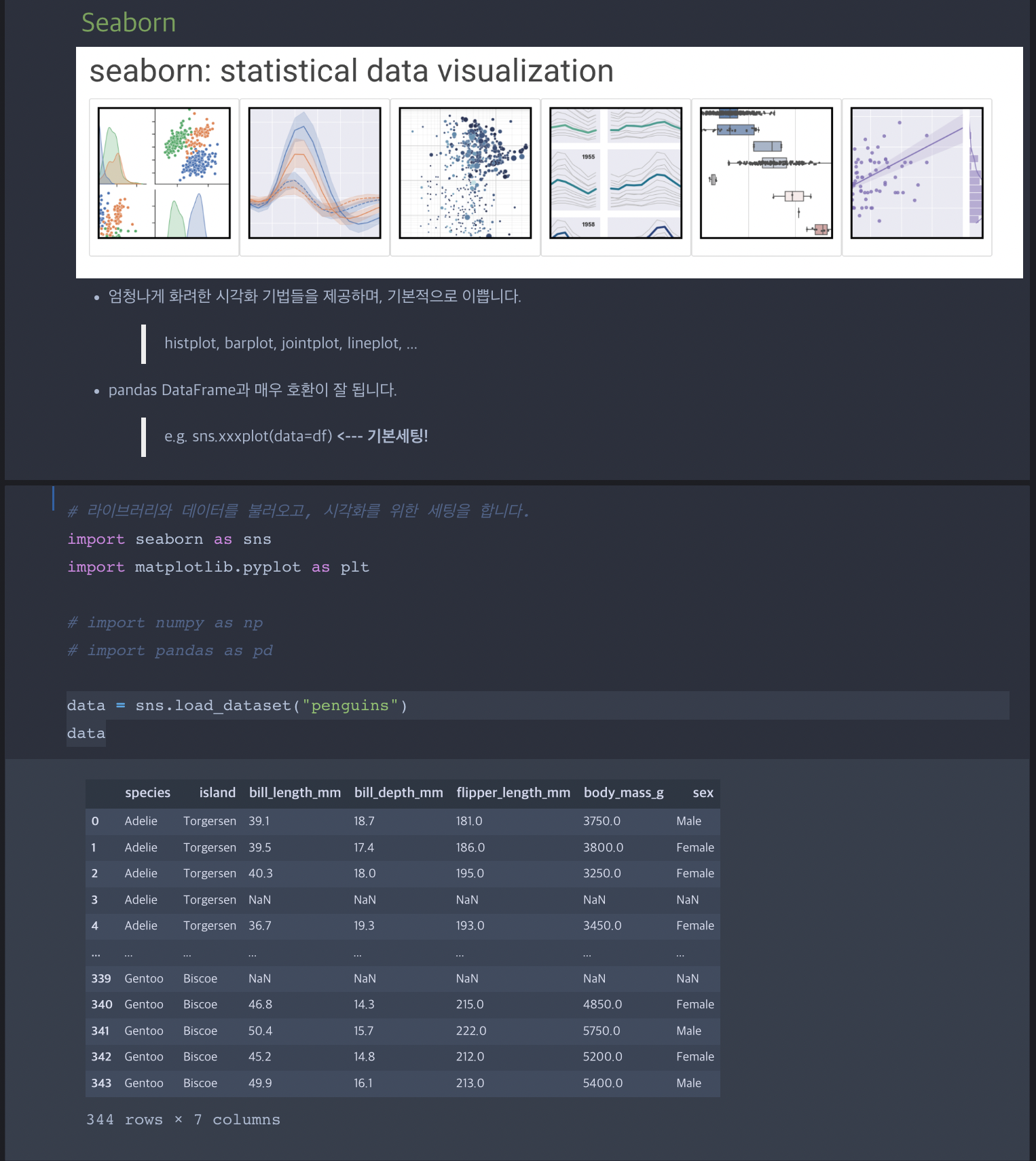 | Part 2. 파이썬 프로그래밍 기초와 데이터분석 | Ch 04_데이터 시각화 | CH04_04. load_dataset 을 이용한 데이터 셋 불러오기 |